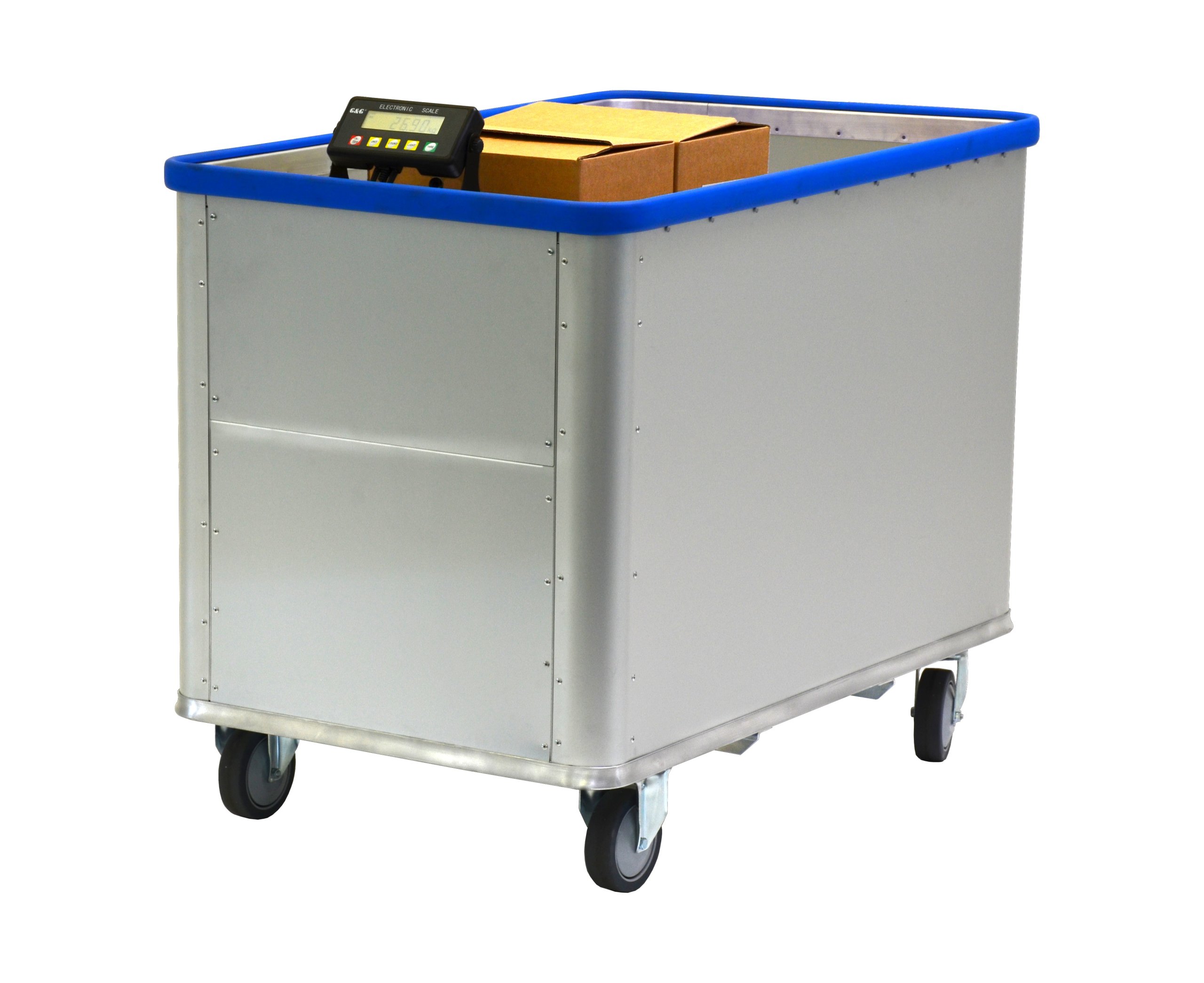 - der lastabhängige, absenkbare Boden des Wagens ist zusätzlich mit einer elektronischen Waage ausgestattet (Waage nicht geeicht und nicht geeignet für den Verkauf nach Gewicht)